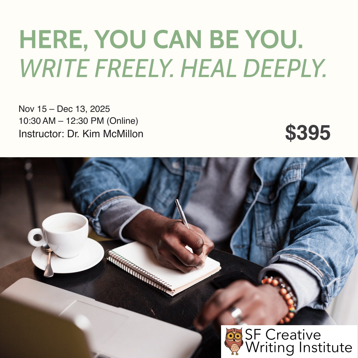 If you are a poet and you’re looking to find beauty in your work again, consider taking Poetry of Healing with Dr. Kim McMillon. It starts next week online at the same time. Both of these classes are designed to support the writer in finding their voice and loving and celebrating themselves throughout the process of healing/creativity. It starts next week.